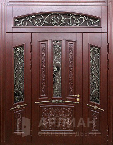 Полуторная входная дверь с элементами ковки и стеклом №72